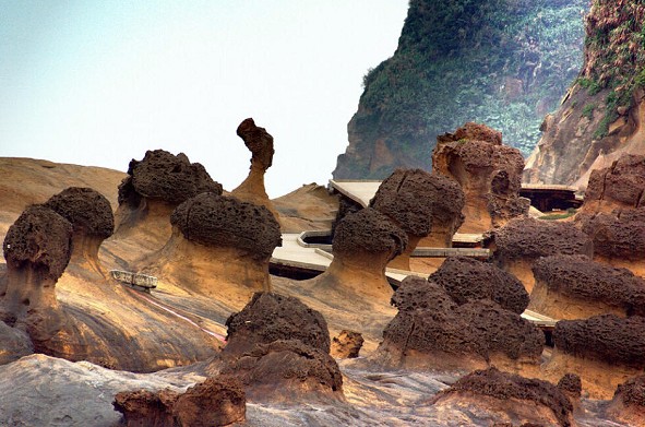 野柳風(fēng)景區(qū)位于臺(tái)灣省基隆市西北方約15公里處的基金公路,是一突出海面的岬角(大屯山系),遠(yuǎn)望如一只海龜蹣跚離岸,昂首拱背而游,因此也有人稱之為野柳龜。受造山運(yùn)動(dòng)的影響,深埋海底的沉積巖上升至海面,產(chǎn)生了附近海岸的單面山、海蝕崖、海蝕洞等地形,海蝕、風(fēng)蝕等在不同硬度的巖層上作用,形成蜂窩巖、豆腐巖、蕈狀巖、姜狀巖,風(fēng)化窗等世界級(jí)的巖層景觀。