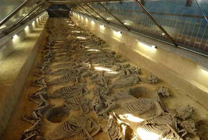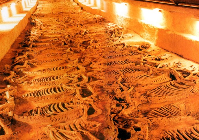 據(jù)專(zhuān)家考證,殉馬多數(shù)是 6--7 歲口的壯年馬,是人為處死后,按照一定的葬式排列而成,馬分兩行,排列整齊,昂首側(cè)臥,四足蜷曲,呈臨戰(zhàn)姿態(tài),好像只要聽(tīng)到戰(zhàn)鼓擂動(dòng)還會(huì)四蹄騰空。