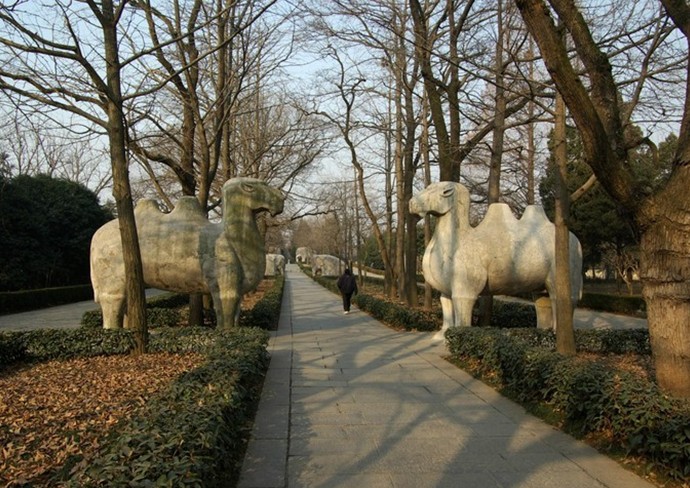 明孝陵石像生共18對,其中文臣3對、武將3對、站臥馬各1對、站坐麒麟各1對、站臥象各1對、站臥駱駝各1對、站坐猊各1對、站坐獅子各1對。另有望柱1對。所有石雕像均以整塊石料雕成。不刻意追求形似,而注重神似,其風格粗獷、雄渾、樸拙、威武,氣度非凡。這組石雕對稱地排列在神道兩側,南北長800多米,構成威武雄壯的長長隊列,使皇陵顯得更加圣潔、莊嚴、肅穆。孝陵石像生是明代陵寢中規(guī)模最大、最具特色的一組。