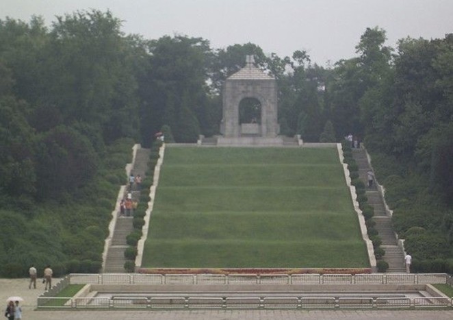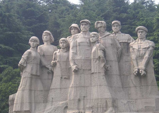 雨花臺(tái)陵園大門由花崗石砌成,高11.7 米。大門內(nèi)三面環(huán)山的廣場(chǎng)上聳立著一座烈士群雕,雕像高10.3米、寬14.2米,由179塊花崗石拼裝而成,是我國(guó)目前最大的花崗石群雕。雕像采用了上實(shí)下虛的手法,著重刻劃了烈士的面部神態(tài)。兩側(cè)的環(huán)陵大道可直達(dá)雨花臺(tái)主峰,主峰上矗立著一塊4.23 米高的石碑,碑身正面鐫刻著鄧小平親筆題寫的"革命烈士紀(jì)念碑"七個(gè)金字,背面刻著紀(jì)念碑文。碑前還豎有一座高5.5米的烈士青銅塑像。在紀(jì)念碑南邊的山崗上還有一座呈"U "字型,頗具民族風(fēng)格的花崗巖結(jié)構(gòu)的大型建筑--"革命烈士紀(jì)念館"。館長(zhǎng)94米、寬49米,主堡高26米,建筑面積5900平方米,館內(nèi)陳列著烈士們的遺像、遺書和遺物等。