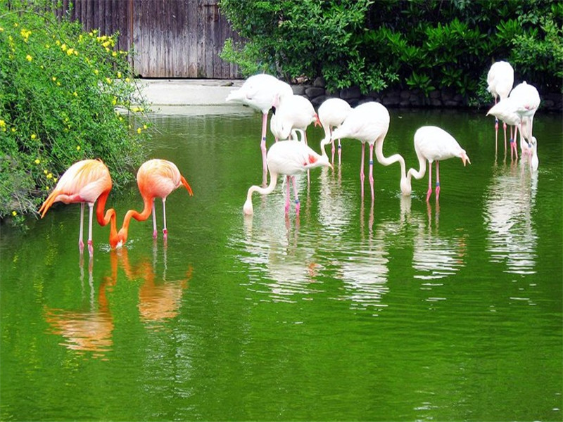 火烈鳥展區(qū)位于正大門口,共展出88只火烈鳥,有迎賓小姐的美稱,紅色的是美洲火烈鳥,粉紅色的是歐洲火烈鳥。它們有“Z”字形的長(zhǎng)頸和鐮刀形的長(zhǎng)嘴。此外它們還有一雙蜘蛛般的長(zhǎng)腿,顏色發(fā)紅。它們有著獨(dú)特的淡朱紅色的羽毛。遠(yuǎn)遠(yuǎn)看去宛如一團(tuán)火球。所以又有“火鶴”之稱更奇特的是無(wú)論它們的羽毛如何美麗,一經(jīng)拔下就變成白色。它們的嘴和眼也生的與眾鳥不同:嘴細(xì)長(zhǎng)彎曲向下,色多淡紅,基部為黃色,眼睛又細(xì)又瘦,與它們那龐大的身軀很不協(xié)調(diào)。