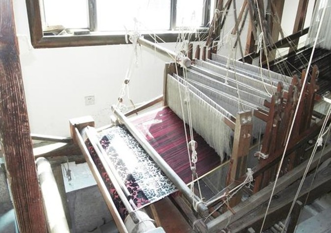 沿絲路右側(cè),一組沙漠駝隊(duì)的浮雕,形象生動,古樸渾厚,與半墻有機(jī)結(jié)合,顯示了漢唐以來絲綢之路的風(fēng)光特色。“古代館”的絲綢陳列,以其珍貴的絲綢文物及模型、圖片,展示了新石器時代晚期絲綢的起源,直到明清時期絲綢生產(chǎn)的沿革,它是一部濃縮了的中國古代絲綢史。絲綢離不開蠶桑,“蠶桑居”是根據(jù)近代農(nóng)家養(yǎng)蠶載桑的真實(shí)情景和桑園再造??邕M(jìn)“織造坊”,又是另一番景象,在這里可以見到各種類型的古代織機(jī)和傳統(tǒng)工藝的手工操作表演,猶如身臨明清時期蘇州絲綢業(yè)“東北半城,萬戶機(jī)聲”的繁榮境地??椗畟兩碇叛b作現(xiàn)場表演。天鵝絨織機(jī)、漳緞織機(jī)、云錦織機(jī)、腳踏繅絲機(jī)、纟革絲機(jī),都在進(jìn)行運(yùn)轉(zhuǎn)操作,古代云錦、彩經(jīng)絨、纟革絲等著名絲綢品種的織造過程,在這里都得到充分演示。有一種工藝獨(dú)具特色,讓人看后舍不得離開,一塊巨大的石元寶下的凹槽里,放著纏有絲織品的木棍,一位藝人將兩腳踏在石元寶下的兩個突出部,然后晃動石元寶,通過碾壓,使絲綢變得柔軟平挺。光澤可鑒。這就是江南絲織工藝一絕的絲綢砑光處理。