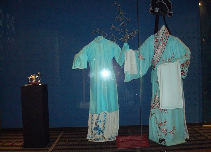 天井里兩側(cè)鋪的是青磚,中間是石板,往里走,應(yīng)該是博物館里最大的展廳,在我踏進(jìn)門(mén)前,聞到了茉莉花的香味,版權(quán)所有山東聊城聊之旅國(guó)際旅行社有限公司,轉(zhuǎn)載必究!掃目看,原來(lái)這個(gè)大展廳兩側(cè)都放著茉莉花,裝在盆里。抬頭仰目,同樣這里也有對(duì)聯(lián),橫批“吳歙萃雅”(注:此歙字像歙非歙,電腦里找不見(jiàn)),左梁“圣旦凈末丑塑就奸佞賢禎相”,右梁“宮尚角徵羽唱徹悲歡離合情”。展廳門(mén)前牌子上寫(xiě)的是“昆劇江湖角色行當(dāng)行頭展”,進(jìn)到里面,感覺(jué)就是廟堂里的大雄寶殿,很寬敞,不過(guò)兩邊不是羅漢像了,都是些行頭之類(lèi)的,比如唐明皇與楊貴妃的黃色服飾;大廳中間當(dāng)然也不會(huì)是三尊佛,而是一個(gè)小型的室內(nèi)戲臺(tái),戲臺(tái)后兩側(cè)卷簾上寫(xiě)著“出將”和“入相”。