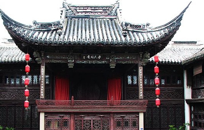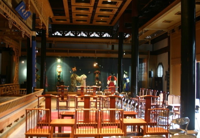 古戲臺(tái)是觀看古戲臺(tái)演出的最佳地方。兩廂墻上掛有昆曲文木雕、磚雕等,既是陳列,又是裝飾,兩廂用竹廉隔成開(kāi)放式包廂,觀眾與游客既在此觀看昆曲表演,亦可休閑品茶。