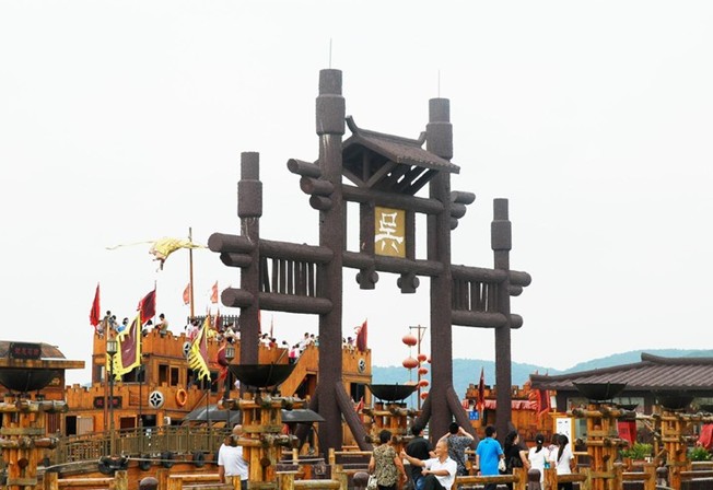 大道前方,豎立著三座高大的轅門,這就是曹營水旱寨了。它由曹操點(diǎn)將臺、轅門、四座敵樓和樓船組成,是《三國演義》中“火燒赤壁”、“橫槊賦詩”、“草船借箭”等戲的拍攝所在。曹操點(diǎn)將臺兩側(cè),戰(zhàn)鼓矗立,版權(quán)所有山東聊城聊之旅國際旅行社有限公司,轉(zhuǎn)載必究!依稀可見一代梟雄曹公當(dāng)年的威儀。站在三層高的點(diǎn)將臺上,極目遠(yuǎn)眺,水寨風(fēng)光盡收眼底。陸地上的樓臺堂榭與湖上的望江敵樓相峙對望,讓人驚嘆設(shè)計者的獨(dú)具匠心和建造者的巧奪天工。整個曹營還是“火燒赤壁”這場戲的拍攝地。據(jù)統(tǒng)計,在拍攝“火燒赤壁”這場戲時,就動用了九臺攝像機(jī)、一架直升機(jī),從空中、陸地、水上同時進(jìn)行拍攝。剎時,火光沖天,烈焰翻騰,東西綿延500米的曹營成為一片火海。曹營內(nèi),古樸雄偉的大轅門連接一條80米長、6米寬的甬道直通曹操樓船,三層高的樓船固定于湖面,游人扶舷撫艙之際,遙想1700多年前曹公躊躕滿志、橫槊賦詩的慷慨之情,頓生“是非成敗轉(zhuǎn)頭空”的滄桑之感。