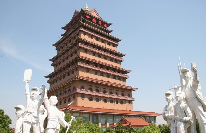 有座下寬上窄、四方形、17層、每層都有飛檐的建筑,華西人稱之為“金塔”。金塔建于1996年,耗資12000萬元人民幣。版權(quán)所有山東聊城聊之旅國際旅行社有限公司,轉(zhuǎn)載必究!這是一座賓館。在沒有高樓的華西村,金塔成為華西的標(biāo)志性建筑,在村中顯得非常醒目。塔上掛著“中國華西”金字橫匾。省略了省,也省略了市,“中國”之下便是“華西”,足見“天下第一村”的知名度之大。塔頂上那熠熠生輝的金黃色葫蘆,用35公斤黃金鍍成。大門口還安放著一座銅雕,是一頭“牛氣沖天”的金牛,腳下是地球。這“金牛踩地球”便是華西村的“村標(biāo)”。
