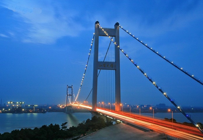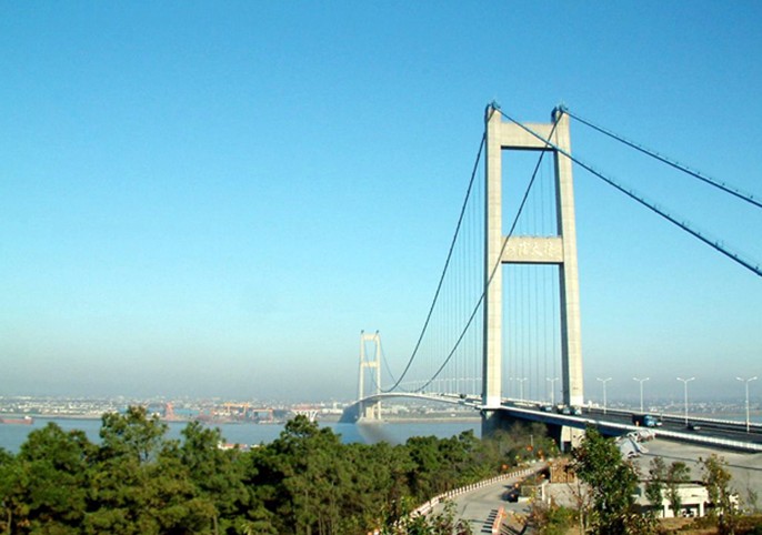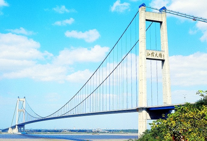 江陰長江公路大橋,位于江蘇省江陰市黃田港以東3200米的西山,橋型采用主跨為1,385m鋼懸索橋。為世界第四、中國第一大橋。1994年開工建設,1999年10月建成通車。
