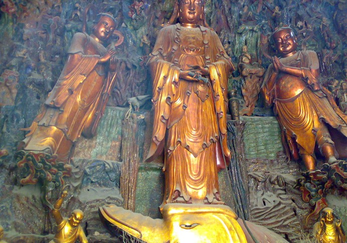 2.正面是大雄寶殿,原稱覺皇殿,單層三疊重檐,氣勢嵯峨,重檐高33.6米,十分雄偉。大殿正中是一座高24.8米的釋迦牟尼蓮花坐像,造像“妙相莊嚴”、“氣韻生動”,頷首俯視,令人景仰,這是中國最高大的木雕坐式佛像之一,是一件不可多得的宗教藝術(shù)作品。正殿兩邊是二十諸天立像,殿后兩邊為十二圓覺坐 像。大殿后壁有“慈航普渡”、“五十三參”海島立體群塑,共有佛像150尊,正中為鰲魚觀音立像,手執(zhí)凈水瓶,普渡眾生,下塑善財童子及其參拜觀音故事,善財童子參拜名師53位,第27參拜見觀音得道成佛。觀音兩側(cè)為弟子善財與龍女,上有地藏菩薩,版權(quán)所有山東聊城聊之旅國際旅行社有限公司,轉(zhuǎn)載必究!再上面是釋迦牟尼雪山修道的場景:白猿獻果、麋鹿獻乳,整座佛山造型生動,很有藝術(shù)價值。靈隱寺的原釋迦牟尼佛像,于1949年大雄寶殿正梁因白蟻蛀空倒塌時被毀?,F(xiàn)在這座佛像是在1953年重修寺宇時,由中國浙江美術(shù)學(xué)院的雕塑家和民間藝人們采用唐代禪宗佛像為藍本共同精心設(shè)計的。佛像高十九點六米,比原先的釋迦造像高一倍多,用近百塊香樟木雕成。佛像造型端莊凝重,氣宇軒昂,低眉細目,極具風(fēng)采。