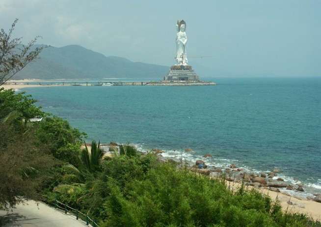 1993年中國國務院宗教局和海南人民政府批準興建南山寺,并在寺前的海中塑108米高之觀音圣像。此像由海南三亞南海海上觀音功德基金會發(fā)心敬建,三尊化一體,巍峨壯觀,實乃世界造像之最。敬造工程因其規(guī)模宏偉、意義殊勝、佛理底蘊豐富,被譽為“世界級、世紀級”的佛事工程。中國佛教協(xié)會趙樸初會長欣然為圣像題名——“南海海上觀音”。
