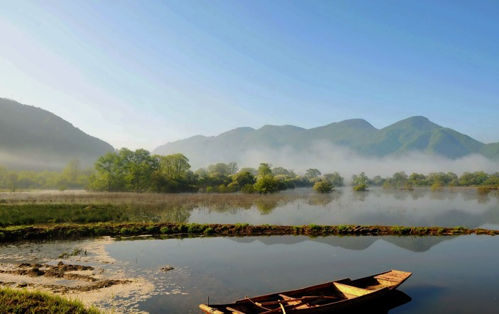 位于渝鄂交界處。是一片沼澤地—山澗盆地,是亞高山的一片濕地。面積3萬多畝,海拔1700米,面積36平方公里,南北長約15公里,東西寬約3公里,中間是一抹17平方公里的平川,四周高山重圍,在“抬頭見高山,地?zé)o三尺平”的神農(nóng)架群山之中,深藏著這樣的處女平地極為少見,大九湖因其享有“高山平原”的美譽,并被稱為湖北的“呼倫貝爾”、“神農(nóng)江南”,大九湖濕地公園總面積3萬畝,海拔1700米,園內(nèi)共分布有高等植物141科366屬964種(含變種及栽培種),其中國家重點保護植物共5種,國家珍貴樹種3種,苔蘚植物13科18種。