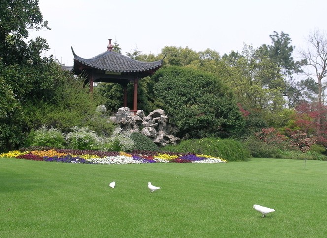 牡丹園西行,山回路轉(zhuǎn)就是密林區(qū),從位置上來講,它們都位于公園的西部。密林區(qū)得用原來的土丘,種植常綠闊葉的叢林,并結(jié)合地形,修建林間小道,環(huán)境寧靜,宜于休息,更是凈慈寺僧侶們每晚散步的最佳去處。 自牡丹亭中眺望,公園東、南、北三面景色盡收眼底。