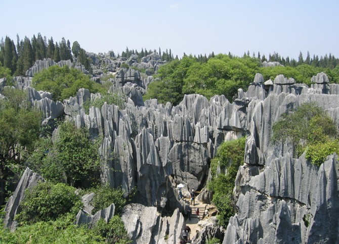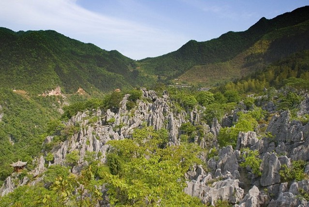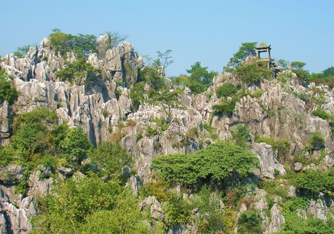 千島湖石林景區(qū)面積20平方公里,是中國(guó)四大石林之一。它位于杭州地區(qū)西邊的淳安縣千島湖,其面積之廣,規(guī)模之大,景觀之奇在華東地區(qū)堪稱(chēng)一絕,被稱(chēng)為“華東第一石林”。千島湖石林是一個(gè)迷宮式的溶巖地貌景觀,由藍(lán)玉坪、玳瑁嶺、西山坪組成。區(qū)內(nèi)群峰壁立,層巒疊嶂,石壁、石柱、石筍、石洞等體態(tài)紛呈,各具特色,有“華東第一石林”的美譽(yù)。是我國(guó)四大石林之一(另三大石林為云南路南石林,四川興文石林,福建大湖石林)。千島湖石林主要有藍(lán)玉坪、玳瑁嶺和西山坪三處。這里海拔650余米,古時(shí)這里稱(chēng)“白云山”。在這崇山峻嶺間,常有云霧茶的產(chǎn)地。這片石林屬迷宮式喀斯特地貌,石峰峭立,千姿百態(tài),峰回路轉(zhuǎn)?;蛉暥.?dāng),或山窮水盡,或豁然開(kāi)朗,或茫然不知所歸。大自然的造化真是奇特,有的移步換峰形,有的一巖多景,鬼斧神工,妙趣橫生。