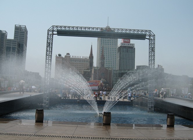 進入廣場后跨過二座平行的小橋,便是亞洲最大的音樂噴泉和超大水幕電影??偼顿Y4000萬元的水景系統(tǒng)呈“L”型,總長200米,主噴泉長達95米,與廣場的中心舞臺遙相呼應,主噴泉的核心是兩座橋之間的號稱“擎天柱”的噴泉,中心的一支大口徑的噴嘴射出直徑達38毫米的水柱,噴高可達40米,形成一柱擎天之勢;整個音樂噴泉有2000個噴嘴,400多臺水泵,全部由電腦控制,采用目前國際上最先進的高壓氣泵式激光音樂噴泉技術,噴泉在激光和音樂的配合下,能高速噴出一個個晶瑩透亮的水柱、水花、能組合出令人眼花繚亂的“高崗花式”、“華爾茲花式”、“蝴蝶展翅式”等幾百種噴泉花式,形成一個美不勝收的“水世界”;同時與噴泉交相輝映的水燈也大放異彩,隨著音樂的變化,一個赤橙黃綠青藍紫的“水光舞臺”,通透明亮,宛如仙境,令人目不暇接,贊嘆不已。在廣場的兩側,噴射的水墻組成一個高20米,寬60米的扇形水幕,對面的建筑上射過來的一道光束和激光投射在晶瑩透明的水幕上,水珠如霰如霧,色彩斑斕的光束與水幕交相輝映,形成一組組生動活潑的畫面——這就是天一廣場的大屏幕水幕電影,巨大的水幕電影中景觀人像清晰可感,恍如夢境,又仿佛觸手可及,令人驚奇。