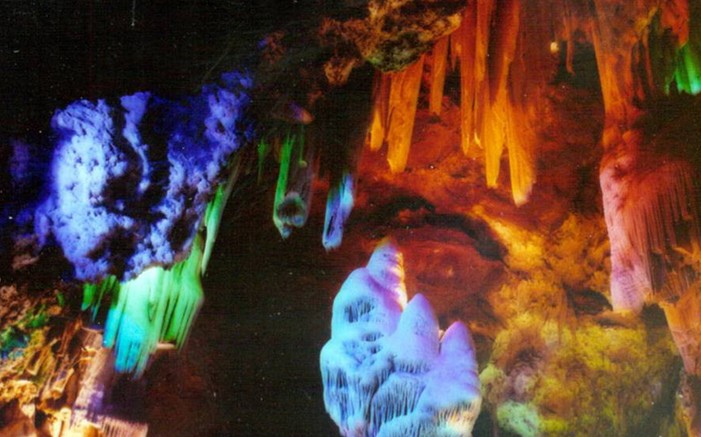 再登第二段鐵梯,便可看到洞壁上螢光點綴的葡萄狀石花,姹紫嫣紅,或成串,或散開成片,異常珍貴。與石葡萄為鄰的還有一根直徑為0.05米,高3.1米的石柱,粗細(xì)均勻,筆直挺立,被稱為“定海神針”,這也是洞內(nèi)最細(xì)的石柱,屬重點保護景觀。而與石葡萄相隔3米,洞壁上覆蓋著一層枝芽狀石花,形如海中珊瑚,熠熠生輝,這些就是珊瑚石。