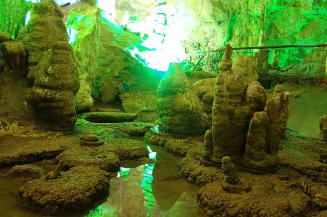 到溶洞進(jìn)口,通過長30米,高2.5米的人工隧道,便進(jìn)入第一景區(qū)玉柱潭,洞頂最高處距地面49米,可同時容納500余人。景區(qū)內(nèi)石筍、石柱密布,高低粗細(xì)不等,是洞內(nèi)石筍、石柱最集中的一個景區(qū),又因其間有一潭清澈的地下池水,所以景區(qū)得名“玉柱潭”。