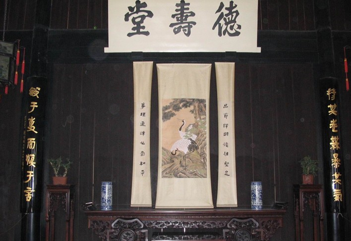 第二進(jìn)為廳堂,俗稱“大堂前”,是周氏族人的公共活動場所,以作喜慶、祝福和宴會賓客之用。廳堂正上方高懸一塊大匾“德壽堂”,兩旁柱子上有一副紅底黑字的楹聯(lián):
