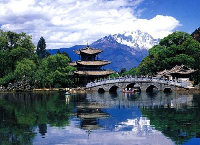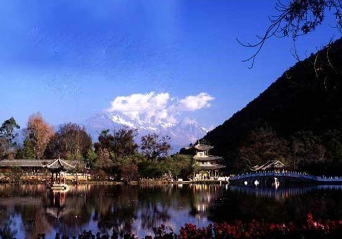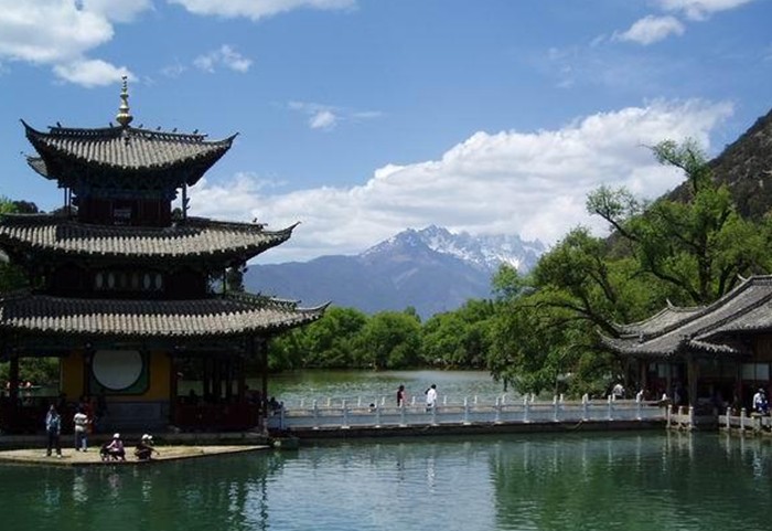 云南麗江黑龍?zhí)叮蝴惤邶執(zhí)队置袢珗@,位于城北象山腳下,從古城四方街沿經(jīng)緯縱橫的玉河溯流而上,約行一公里有一處晶瑩清澈的泉潭,即為中外聞名的黑龍?zhí)?。潭水從石縫間涌涌噴出,依山斛清泉匯成四萬(wàn)平方米潭面。四周山清水秀,柳暗花明。依山傍水造型優(yōu)美的古建筑點(diǎn)綴其間。其流韻溢彩,常引人駐足留連。