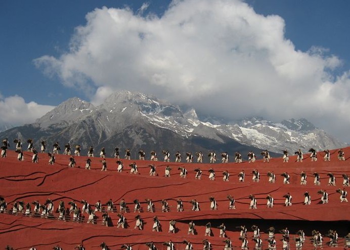 《印象麗江》導(dǎo)演張藝謀:“這里有一個(gè)世界上最大的一次幕間休息,但觀眾并沒有離開演出所營(yíng)造的情境。你可以去河邊小坐、品茗小酌,還可以去討價(jià)還價(jià)、拍照留影,但不論你做什么,你已經(jīng)在和納西人民的交往之中。”