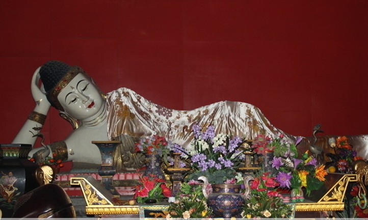 穿過天王殿,其后有大雄寶殿。殿內(nèi)供奉著釋迦牟尼、阿彌陀佛、藥師佛的神像,屏墻后面懸塑觀音像,兩側(cè)有十八羅漢侍立。大雄寶殿之后,又有藏經(jīng)閣藏書八百萬卷,這是寺僧藏經(jīng)說法的場所。殿前甬道有明萬歷年間鑄造的大鐵鐘一口,重約650公斤。藏經(jīng)閣的東南面是禪房,是僧人參禪打坐的地方,對面的西禪房,則是負(fù)責(zé)接待賓客的堂室。