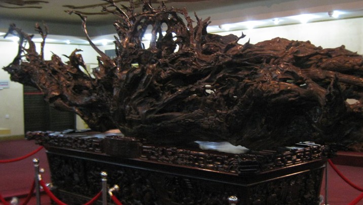 《中華根展覽》是由千年古樟巨根雕制而成。它長6.30米,高2.30米,其狀屈曲崢嶸,其勢鳳翥龍蟠,是為“養(yǎng)在深閨人未知”之珍寶。它鐫刻著女媧補天、夸父追日、大禹治水、赤壁賦等遠古傳說,歷代史事,英烈忠魂,前修偉業(yè),煌煌五千年文明史,盡覽于一根。洋洋灑灑百余構圖,故事經典,場面恢宏,造型傳神,栩栩如生,嘆為觀止。四周星羅姿態(tài)各異精品根藝80余類,根造型、根拼字、根貼畫、根包石、竹蔸雕……品類繁多,琳瑯滿目。每件根藝標示牌均配以詩文,新穎別致,內涵博深,耐人品味。觀者感慨:通觀此展,仿若閱讀一部歷史巨著,又似步入大千文學殿堂,更象闖進精美絕倫的藝術大觀園,不知不覺中,深受傳統(tǒng)美德和民族精神的熏陶。