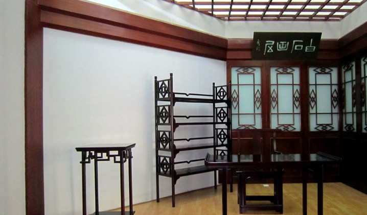 白石先生的畫室里陳列著白石大師曾用過的畫案即兩頭沉的硬雜木寫字臺(長約1.4米,寬0.7米),案上擺有白石先生用過的毛筆、古硯、筆洗、平底小勺、刻刀、筆筒及蟋蟀斗等。墻上掛一幅白石作品水蓼草蟲。北面擺放硬木雕花大立柜,(高2米×1.2),西邊擺一個比那個小些的小立柜。門外掛一竹簾,看起來畫室極其簡樸。再看齊白石先生創(chuàng)作成百上千萬元的精品力作,用過的毛筆也并不出奇,畫案筆架上擺放著三只毛筆,一只是純羊毫大門斗,兩只中楷兼毫筆,筆桿都是普通竹桿,案頭右邊還放著一只更大一些關毫筆,都很普通,看來當時做畫的條件太差了,如果有現(xiàn)在這個條件和環(huán)境,白石大師創(chuàng)作的精品還要多的多。