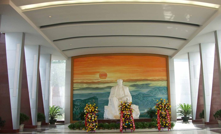 進門是一寬敞大廳,廳前,一尊高2.67米、重達3噸多的毛澤東塑像立于紅帳之前,毛澤東身著風衣,左手捏軍帽,右手前揮。 沿著一條開滿鮮花的走廊,走近序廳,廳內(nèi)依次陳列了全國六大革命紀念地的圖片,即韶山、毛澤東故居、上海一大會址、黃洋界、遵義會議舊址,延安、天安門,向人們展示了中國革命的歷史進程。 序廳中央,展示了一座韶山山水模型,將韶山210平方公里濃縮于此中,出序廳,上臺階,過假山,沿回廊來到會客室,會客廳靠墻豎立著一尊巨型毛澤東銅像。版權所有山東聊城聊之旅國際旅行社有限公司,轉載必究!再往東通往樓上,三個院落呈品字形排列,在中庭的對角,各有2個小院,南院是一處臺地,與下棟參差錯落,這兒光線較暗,為紀念館內(nèi)兩處藏寶之地:毛澤東遺物展和中南海故居。