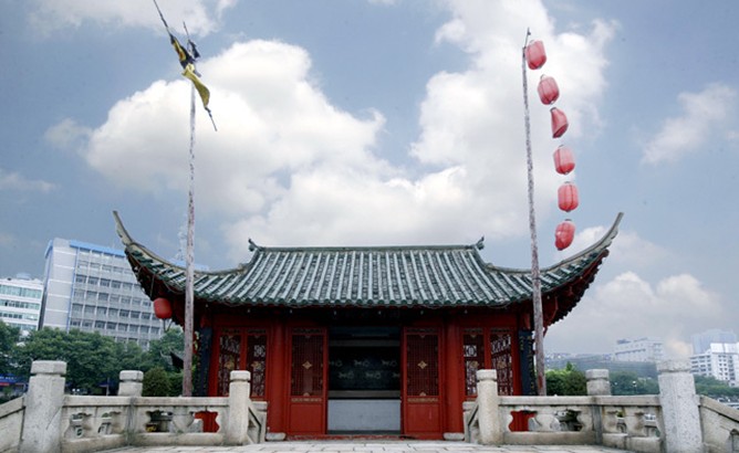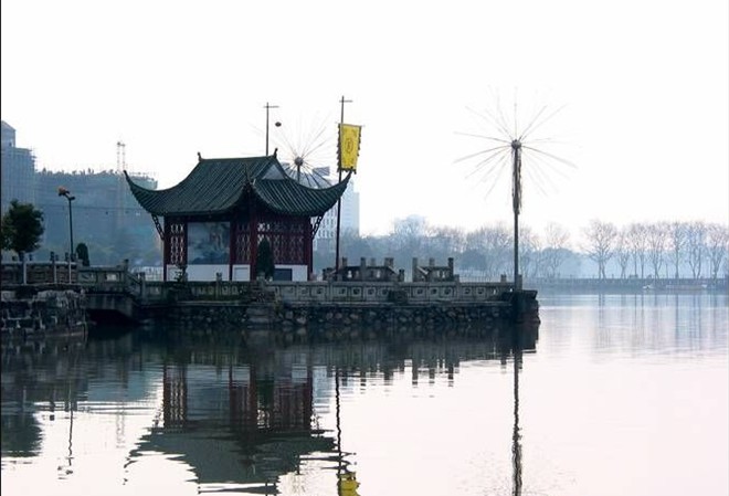 周瑜點將臺位于江西省九江市東北古桑落洲上(今安徽省安慶市宿松縣匯口鎮(zhèn)曹湖村),為一丈多高城樓,臺基長30米,寬16米,花崗石砌,建在傳說的點將臺遺址上面?,F(xiàn)樓,明天順二年冬重修,臺上建筑磚木結(jié)構(gòu),版權(quán)所有山東聊城聊之旅國際旅行社有限公司,轉(zhuǎn)載必究!長18米,寬11米,面積200多平方米,分正廳與左右?guī)?,房前立柱,木楔穿架,雀蓮均飾云紋或花鳥紋,頂為碧翠的琉璃瓦,四角起翹,雕梁畫棟,頗顯壯觀。雖一度稱鐘鼓樓,一般仍叫周瑜點將臺。傳說是東吳大都督周公瑾檢閱水師和操練兵馬的地方,故臺前原有周瑜石馬槽,毀于1966年。據(jù)《三國志周瑜傳》記:“建安十一年,周瑜督討麻保二屯,還兵守備宮亭(指鄱陽湖)。又敗江夏太守黃祖,并生擒其部將鄧龍于柴桑(今九江縣)。”又據(jù)《志》記載:“漢建安十四年,孫權(quán)曾命周瑜向鄱陽湖教習水軍”,可見,原來確實有臺用以點將,亦可想像昔日臺上旌旗招展,前場刀光戟影,湖面戰(zhàn)船穿梭,壯烈激越的場面。如今登上城樓,憑欄放目,湖水波茫,漁帆點影,清風徐來,令人陶醉。 九江市區(qū)甘棠湖中煙水亭前亦建有周瑜點將臺。