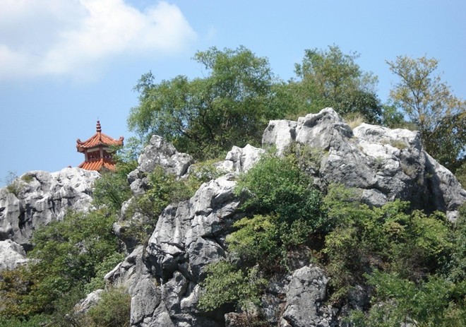 石林位于溶洞山頂,是古生代地殼變動而形成,距今有3億多年,面積1000余畝。山上怪石嶙峋,奇花異草點綴其間,相依叢生,風(fēng)光明媚。有桃花谷、松漠亭、達開峰、藤穿石、象鼻石、強盜床、雙龍戲珠、騎虎難下、八戒戲嫦娥等景觀。景點林濤如潮、林谷如云,讓你猶如步入仙境般的身臨其境。千畝如詩如畫的石林中古樹名木遍布,珍禽異獸出沒,野花遍地開,小鳥林中鳴,置身其中,如至夢幻中,以奇石、奇樹、奇藤、奇峰著稱。奇石:造型奇特、惟妙惟肖,有形狀似白兔、鯨魚、山羊、山猴、野豬、蛇、大象、龍等動物,這里石石皆景,景景不同。奇樹:古樹盤踞、丹桂叢聚、翠竹搖拽,與奇石緊緊摟抱。奇藤:千年古藤、環(huán)石纏繞,藤纏樹、樹纏藤。奇峰:青山幽谷,流水叮咚,這里有強盜峰、松漠亭、獨秀谷、情人谷、幽情谷、南星巖、神寶峰、獅嘯峰、珍珠巖等。攀上光明頂,極目遠眺,那蒼蒼茫茫的林海,時隱時現(xiàn)的群峰,風(fēng)光明媚的田園風(fēng)光盡收眼底。置身于此,如到了世外仙境之中,令您流連忘返。