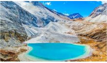 牛奶海,又叫俄絨措,古冰川湖,狀如水滴,四周雪山環(huán)繞,湖水清瑩碧藍,山止成瀑,以其玲瓏秀雅水色翠藍而著名。牛奶海在央邁勇的山坳里,呈扇貝形,中間是碧藍的雪水,周邊則是一圈乳白色環(huán)繞,這圈乳白色大致就是牛奶海名稱的由來。近岸邊的水略有些黑色,下面都是遠久植物的沉積,往里面是淺綠色的一帶,再深處便是碧藍色的水面,藍得透亮。海子微微有些流動,陽光透過云層在上面不停地掠過,于是它也如寶石般變幻著光彩,時而黯然,時而耀眼,時而又飄忽不定。海子邊是片片草甸和碎葉叢,軟軟的,像塊綠色的絨布,小心地呵護著這塊寶石。草甸上面是堅硬石壁,還有沙石灘,顯得格外冷峻。 牛奶海是美麗的,遠遠望去,仿佛碧玉鑲嵌在雪山之中,純凈安詳。純凈的湖水給人以平和安寧的心境,而藍湛湛的海子并不透明,顯得神秘莫測。