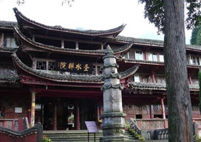 峨眉山圣水禪院原名神水庵、神水閣,有五重殿宇,全寺的殿堂和附屬房屋全系木制結(jié)構(gòu)。禪院原為明代安慶巡撫吳用先的舊居,因周圍“修竹萬竿”,有“水竹色相繞,碧花動軒楹”(唐,孟郊 《旅次洛城東水亭》)的意境,取名“水竹居”。明萬歷末年(約公元1619年),因水竹居前有“玉液”神水,遂改宅為寺,名“神水庵”。寺院前有一塔,傳為隋代智者大師衣缽塔。