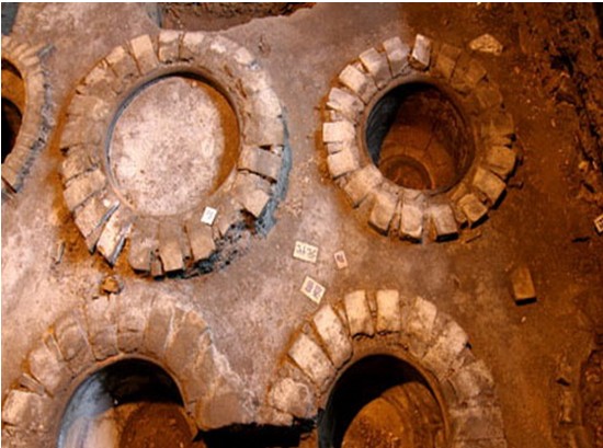 遺址位于李渡鎮(zhèn)紅石橋李渡酒廠老廠區(qū)內(nèi),元代至近現(xiàn)代燒酒作坊遺址。遺址考古勘探面積1600平方米,2002年考古發(fā)掘面積300平方米。揭露的文化堆積主要為元、明、清遺跡與遺物。其文化堆積的11個層面分為南宋、元、明、清、近代、現(xiàn)代6個時期,未見南宋遺跡,其余5個時期的釀酒遺跡有水井、爐灶、晾堂、酒窖、蒸餾設(shè)施、墻基、水溝、路面、灰坑、磚柱等。水井位于遺跡中心部位,始建于元代,后經(jīng)增高,深4.25米,六邊形紅麻石井圈,口徑0.66-0.72米,井臺三合土筑。爐灶始建于明代,紅石與青磚砌,長徑2.80米,短徑1.42米,殘高1.98米,煙道位于頭端兩側(cè);灶前操作坑呈“凹”字形,長2.70米,寬1.60米,深1?84米。晾堂2處,明代晾堂50平方米,清代晾堂40平方米,卵石與三合土筑,表面不平,邊界用紅石砌。酒窖22個,其中元代酒窖13個,直徑約0.65-0.95米,深約0.56-0.72米;明代酒窖9個,有6個至今仍在使用,直徑0.9-1.1米,深約1.52米。