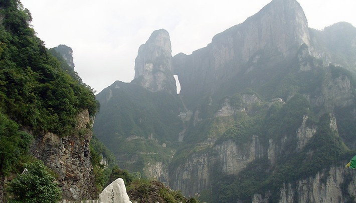 天門(mén)山,古稱云夢(mèng)山、嵩梁山,是張家界永定區(qū)海拔最高的山,距城區(qū)僅8公里,因自然奇觀天門(mén)洞而得名,最早被記入史冊(cè)的名山。三國(guó)吳永安六年(公元 263 年),嵩梁山忽然峭壁洞開(kāi),玄朗如門(mén),形成迄今罕見(jiàn)的世界奇觀――天門(mén)洞,從此而得名天門(mén)山。山頂相對(duì)平坦,保存著完整的原始次生林,有著很多極為珍貴和獨(dú)特的植物品種,森林覆蓋率達(dá)90%。其間古樹(shù)參天,藤蔓纏繞,青苔遍布,石筍、石芽舉步皆是,處處如天成的盆景,被人譽(yù)為世界最美的空中花園和天界仙境。2012年7月22日中午,法國(guó)輪滑大師讓伊夫•布朗杜挑戰(zhàn)天門(mén)山。