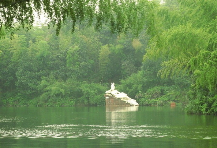 伐舟湖心,清涼的風(fēng)使人身心爽暢。竹筏揚(yáng)起的清清碧波,層層漣漪,漫連著四周碧的蕨綠的竹。湖的深處,瑤箐仙子正臨波浴身,她那流瀑般的秀發(fā)輕柔地披散在萬點(diǎn)柔光的碧波中,一雙白皙而修長的胳膊正掬起一抔瓊漿澆灑在秀美的臉頰上,珍珠般的水在她如雪似玉的肌膚上滾動(dòng),熠熠生輝。岸邊,臨水而建的竹亭、竹廊、竹寨,在翠竹的掩映下,絢麗多彩。