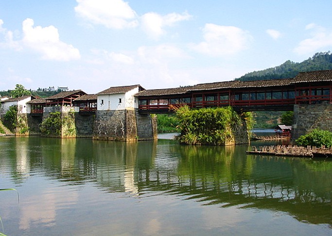 婺源有一種頗有特色的橋——廊橋,所謂廊橋就是一種帶頂?shù)臉?,這種橋不僅造型優(yōu)美,最關(guān)鍵的是,它可在雨天里供行人歇腳。宋代建造的古橋——彩虹橋是婺源廊橋的代表作。這座橋取唐詩“兩水夾明鏡,雙橋落彩虹”的意思取名。橋長140米,橋面寬3米多,4墩5孔,由11座廊亭組成,廊亭中有石桌石凳。版權(quán)所有山東聊城聊之旅國際旅行社有限公司,轉(zhuǎn)載必究!彩虹橋周圍景色優(yōu)美,青山如黛,碧水澄清,坐在這里稍作休憩,瀏覽四周風光,會讓人深深體驗到婺源之美。