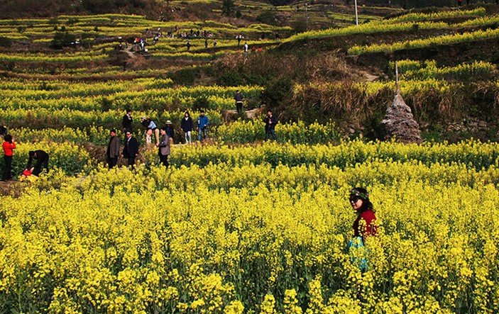 江嶺梯田隨著四季的變幻,景色也各不相同,她好似山里的大妹子,不時在用各種色彩裝飾著自己,有時顯得嫵媚、有時顯得熱烈、有時顯得奔放、有時顯得深沉……春天的江嶺,是一片金黃色油菜花的世界。初春的江嶺,天氣一會兒寒、一會兒暖,一會兒晴、一會兒雨,雖有春的感受,但卻隱約模糊。待到油菜花盛開之時,就是一幅春日融融、春風和煦的景色。層層疊疊的油菜花滿山滿野地盛開著,那菜花黃得質(zhì)樸、黃得純情、黃得熱烈、黃得坦誠。清早那油菜花的花瓣上還帶著水珠,在春日柔和陽光的映照下,晶瑩中透出嫵媚。而傍晚落日的余暉又為滿嶺的油菜花披上了一層朦朦朧朧蒙的細紗,猶如天上流云,又似一道飄落的晚霞,微風拂過,送來一縷縷淡淡的清香。春天里江嶺梯田這一片油菜花,似一個大山中美麗的少女,她招來了蜜蜂、引來了蝴蝶、也迎來了八方游客。