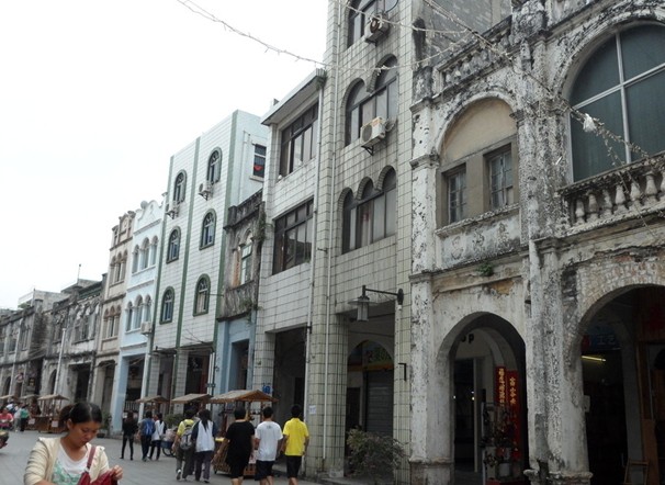 北海老街——珠海路是一條有一百多年歷史的老街,始建于1883年,長(zhǎng)1.44公里,寬9米,沿街全是中西合璧騎樓式建筑。這些建筑大多為二至三層,主要受19世紀(jì)末葉英、法、德等國(guó)在我市建造的領(lǐng)事館等西方卷柱式建筑的影響,臨街兩邊墻面的窗頂多為卷拱結(jié)構(gòu),卷拱外沿及窗柱頂端都有雕飾線,線條流暢、工藝精美。臨街墻面部不同式樣的裝飾和浮雕形成了南北兩組空中雕塑長(zhǎng)廊。這些建筑臨街的騎樓部分,既是道路向兩側(cè)的擴(kuò)展又是鋪面向外部的延伸,人們行走在騎樓下,既可遮風(fēng)擋雨又可躲避烈日;騎樓的方形柱子粗重厚大,頗有古羅馬建筑的風(fēng)格。
