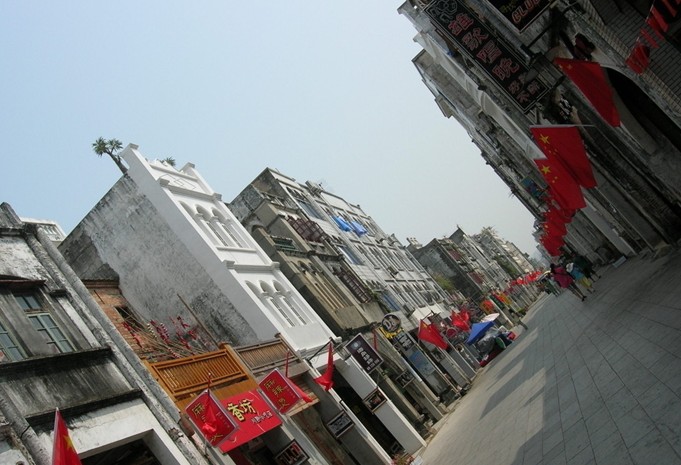 老街的建筑有自己的地域特色,又吸收了嶺南建筑的特點(diǎn),還吸取了西方建筑的一些藝術(shù)風(fēng)格,前店后居的建筑格局、中頂鋪、拖籠門、西式女兒墻裝飾.