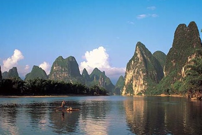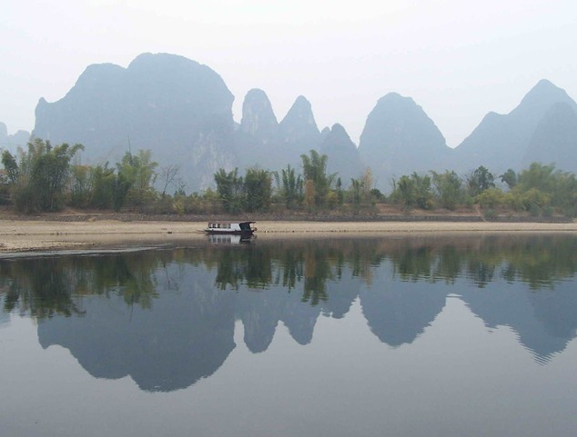黃布倒影是漓江精華中的精華,位于漓江83公里精華段興坪古鎮(zhèn)境內(nèi),游船經(jīng)過(guò)楊堤,過(guò)了九馬畫山,江面逐漸開(kāi)闊,水平如鏡,青峰倒影,美不勝收。離畫山之南不遠(yuǎn),便是黃布灘。漓江山色之美,美在倒影中;漓江倒影之美,就數(shù)黃布灘倒影最為醉人。這里江流清澈,碧綠透底,從水面上可以看到江底有塊米黃色的大石板,長(zhǎng)、寬各數(shù)丈,恰似一匹黃布平鋪在河床之上,黃布灘由此得名。