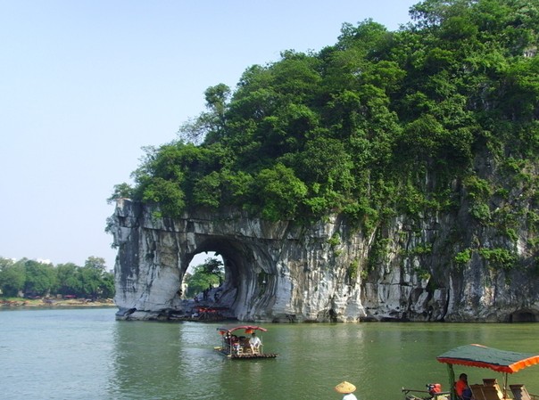 象鼻山又稱象山。明代詩人孔鏞寫道:“象鼻分明飲玉河,西風(fēng)一吸水應(yīng)波。青山自是饒奇骨,白日相看不厭多。”這一百看不厭的象鼻山位于城南漓江和桃花江的江流匯合處。山形酷似一頭巨象,伸長鼻子臨江吸水,因而得名。