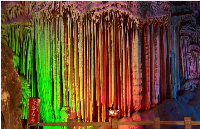 在桂林市西北7千米處的光明山上,因洞口長(zhǎng)有蘆荻草,其可制牧笛而命名。蘆笛巖是一個(gè)地下溶洞,深230米,長(zhǎng)約500米,最短處約90米,其游程雖比七星巖短,但景色卻比七星巖更奇。蘆笛巖內(nèi)鐘乳石,石筍、石柱、石幔,石花玲瓏多姿,景象萬(wàn)千,由此所組成的雄偉“宮殿”、高峻“山峰”、擎天“玉柱”、無(wú)邊“林海”無(wú)不雄奇瑰麗,耀眼奪目,因此蘆笛巖享有“天然藝術(shù)宮”之美稱(chēng),與七星巖并列為“桂林兩大奇洞”。蘆笛洞內(nèi)景點(diǎn)有獅嶺朝霞、石乳羅帳、青松翠柏、盤(pán)龍寶塔、云臺(tái)攬勝、簾外云山、原始森林、琉璃宮燈、遠(yuǎn)望山城、幽景留聽(tīng)等。