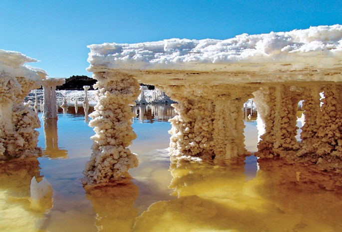 鹽湖地處戈壁瀚海,這里氣候炎熱干燥,日照時間長,水份蒸發(fā)量遠遠高于降水量。因長期風吹日曬,湖內(nèi)便形成了高濃度的鹵水,逐漸結(jié)晶成了鹽粒,湖面板結(jié)成了厚厚的鹽蓋,異常堅硬。這種鹽蓋承載能力很大,汽車、火車可以在它上面奔跑,飛機可以在它上面起落,甚至可以在它上面建房屋、蓋工廠。著名的青藏鐵路、敦格公路和中國最大的鉀肥廠察爾汗鉀肥廠,都是修建在察爾汗鹽湖之上的。青藏公路和青藏鐵路通過鹽湖,路基全是用鹽鋪成,長32千米,分別被稱為萬丈鹽橋和鋼鐵彩虹。