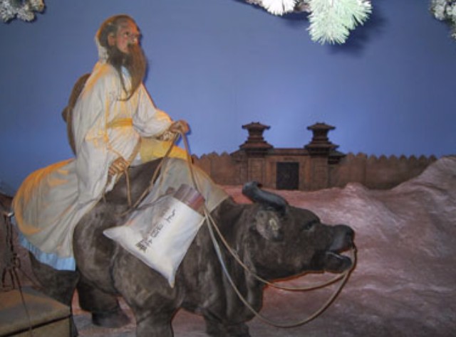 來到我國著名思想家,道德學派創(chuàng)始人,安徽渦陽人的老子展位,只見騎在青牛背上的老子,白發(fā)蒼蒼,目光炯炯有神,正緩緩向前走來,他身旁是挑著行囊的書童。隨著呼嘯的風聲,天空飄起了鵝毛大雪,轉眼間便白茫茫一片,眼前“秦界”,函谷關依稀可見。老子手中握著的牛繩一起一落,青牛不斷發(fā)出“哞哞”的叫聲,正向函谷關進發(fā),準備西去流沙。由于展區(qū)內(nèi)的人物、景物采用了光電技術,人物與場景均十分逼真。