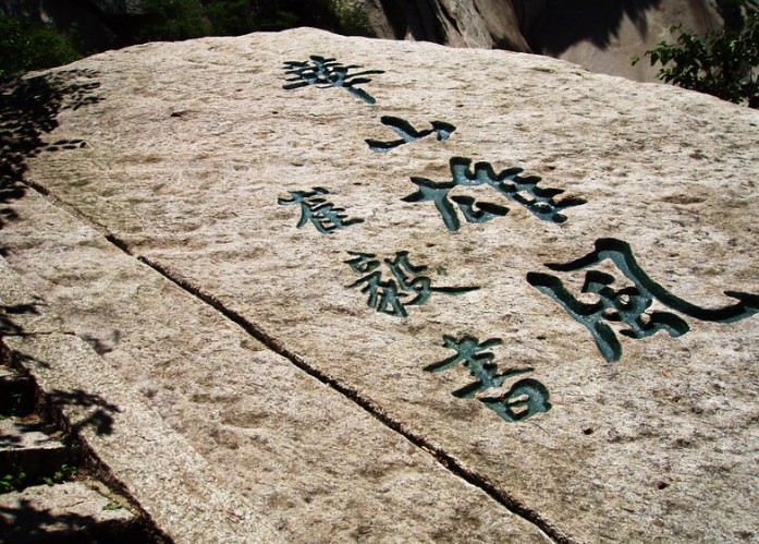 蒼龍嶺如一條橫臥在兩山之間的巨龍,在四周山色的映襯下,嶺下平臺(tái)酷似曲卷的龍尾,嶺盡處是懸石,如同回首怒吼的龍口。在龍口“云海”石刻下,肖四個(gè)圓,其中左側(cè)豎排的兩個(gè)只有圓周,而無圓心;但右側(cè)兩個(gè)既有圓周,又有圓心,為華山字謎之首,為“華山第一難題”。若細(xì)心悟之,象形文字中,圓表示“月”,圓中有點(diǎn),表示“日”。據(jù)此石刻謎底為“二月二”日。俗有二月二龍?zhí)ь^之說,在龍口云海下刻此字謎,寓意希望蒼龍永遠(yuǎn)行云布雨,真是恰如其分,匠心獨(dú)有,精紗絕倫。