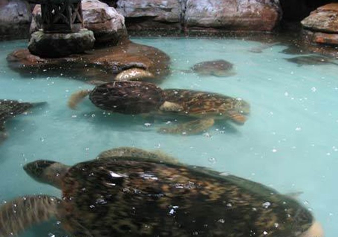在訓(xùn)練馴化了的三十多條鯊魚和兩只大海龜?shù)孽忯~池里,游客配上潛水裝備,在持有世界潛水聯(lián)合會國際潛水員證書的教練一對一地陪同下一起潛游,夠刺激安全又好玩。