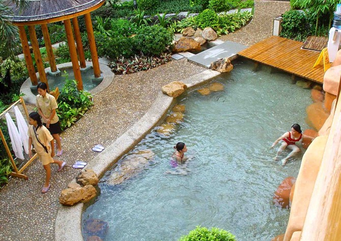 依山而建的古兜溫泉,集山、泉、湖、海為一體,風(fēng)景優(yōu)美,有著豐富的溫泉資源,在古兜山下新近落成的溫泉谷,格調(diào)高雅,打造出一個不同凡響的溫泉王國。溫泉谷中間有一條約150米長的人工鵝卵石河道,它不僅為景區(qū)增添了春山幽谷的野趣,更和中央水區(qū)的大舞臺及各大小泡池相連,將谷內(nèi)建筑群落自然分成了三大區(qū)域:北邊是歐式風(fēng)格的“羅馬殿”,東邊則是日本和式風(fēng)格的“東瀛閣”,南邊是“唐宮”。