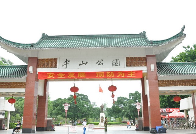 韶關(guān)市中山公園位于市中心區(qū),湞江、武江、北江交匯處,總面積約12公頃。公園以中心大道為主軸線(xiàn),形成了近三萬(wàn)平方米開(kāi)闊的公園城市廣場(chǎng)。主軸線(xiàn)上建有古典大屋頂琉璃瓦大門(mén),孫中山雕像,音樂(lè)噴泉及文藝演出舞臺(tái)等建筑。廣場(chǎng)最高游人容量可達(dá)2萬(wàn)多人。公園沿周邊規(guī)劃了兒童活動(dòng)區(qū)、安靜休息區(qū)、盆景園、竹園以及水景區(qū)五個(gè)小區(qū)。