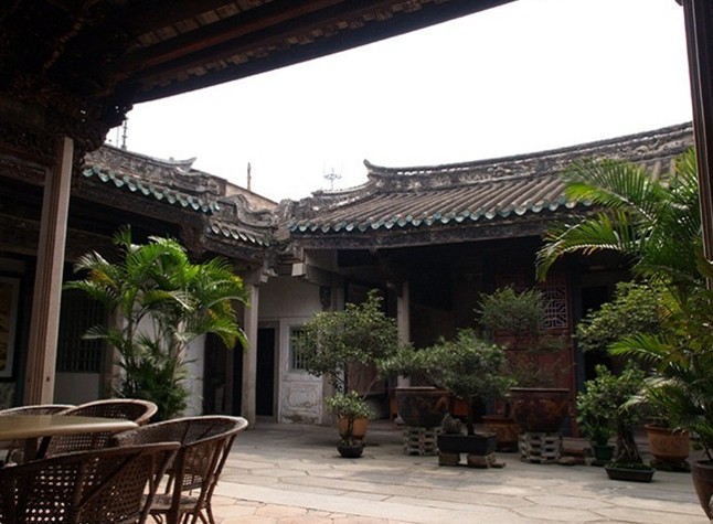 走過門樓,進入前廳,過前進屏門,可見到祠堂中央的天井,天井種有花草,一派春色盎然的景色,另有一番情趣。潮汕建筑的天井,一般不大,講究精巧和儒雅,通常擺有花盆、蓮缸,種上花草,養(yǎng)有金魚,營造一個優(yōu)雅、恬靜環(huán)境。在這種環(huán)境的潮人,他們按部就班地斟酌品味工夫茶和從容不迫地彈流水行云般的潮州弦詩,陶冶儒雅的民性,保持著那種講究精致的心理,這里也不例外。