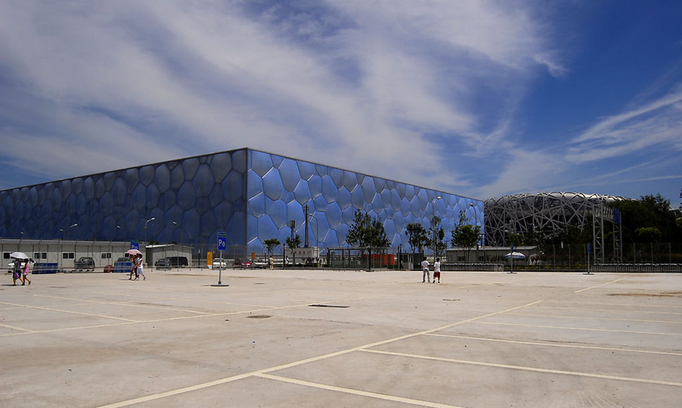 “水立方”位于奧林匹克公園B區(qū)西側(cè),和國(guó)家體育場(chǎng)‘鳥巢’隔馬路遙相呼應(yīng),建設(shè)規(guī)模約8萬(wàn)平方米,最引人注意的就是外圍形似水泡的ETFE膜(乙烯-四氟乙烯共聚物)。ETFE膜是一種透明膜,能為場(chǎng)館內(nèi)帶來(lái)更多的自然光,他的內(nèi)部是一個(gè)多層樓建筑,對(duì)稱排列的大看臺(tái)視野開闊,館內(nèi)乳白色的建筑與碧藍(lán)的水池相映成趣。