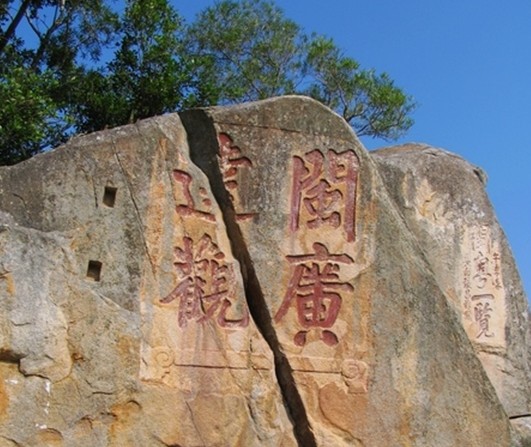 明萬歷五年丁丑季夏(公元1577年)閩粵副總兵晏繼芳題刻的"閩廣達(dá)觀"大字正楷,陰刻、每個字大一米見方。