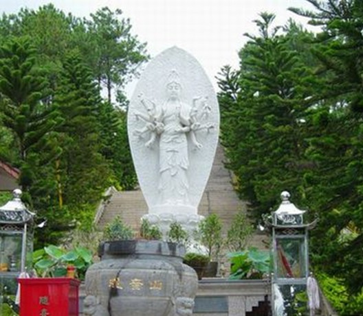 游人踏進(jìn)朱紅色的公園大門,直抵觀音山麓??邕^草地,拾級而上的便是觀音山幸運(yùn)臺階,這是游客登高“迎幸運(yùn)”的最好去處。在大型臺階的平臺上,屹立一尊漢白三千手觀音像,一石成型,身高6.8米,重達(dá)8噸 是目前全國罕見的漢白玉觀音塑像,堪稱中華雕刻藝術(shù)瑰寶。